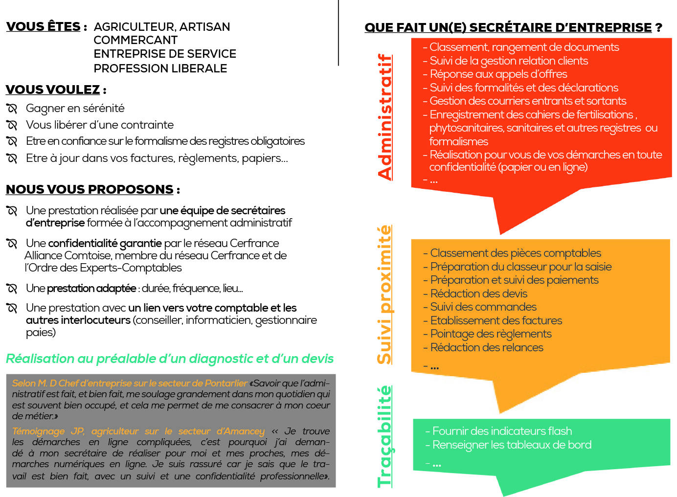 Le secrétariat d'entreprise Cerfrance Alliance comtoise est une prestation réalisée par une équipe de secrétaires d’entreprise. Cette prestation est adaptée à votre rythme. Vous pouvez ainsi choisir la durée et la fréquence selon votre besoin.